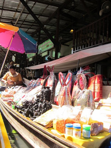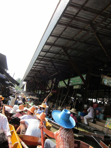今天的重點行程,也是這次團體旅遊的團名,丹能莎朵水上市場(Damnoen Saduak Floating Markets),距離曼谷有一段距離,要花1~2個小時坐車。這條原本是泰皇拉瑪五世所建的運河,古代交通不方便,因此蓋了運河以方便讓此區的居民可以幫便運送貨物到曼谷。 因此許多人家就依著運河蓋起了住家,食衣住行皆依賴運河,水上市場就這麼來的囉(以上是google說的),不過這個行程導遊安排的是手划的船,速度很慢,太陽很大,然後很多的電動船,吃汽油的,油煙味很重,所以我中暑了囧。